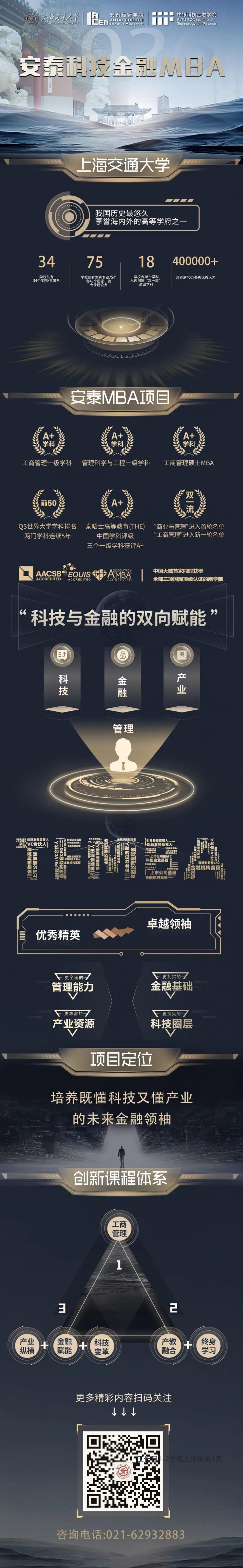 科創(chuàng)賦能金融,雙向助力發(fā)展??萍冀鹑贛BA依托交大安泰強(qiáng)大工商管理學(xué)科實(shí)力,搶占科技發(fā)展與金融創(chuàng)新制高點(diǎn),實(shí)現(xiàn)科技創(chuàng)新與前沿金融的雙向賦能,推動國家科技驅(qū)動創(chuàng)新與高質(zhì)量發(fā)展。