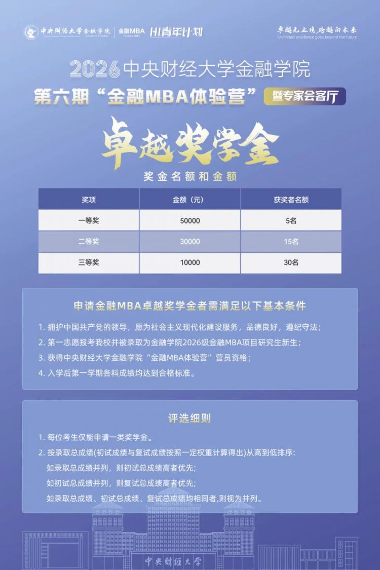 2.第一志愿報(bào)考我校并被錄取為金融學(xué)院2026級(jí)金融MBA項(xiàng)目,獲得我校金融學(xué)院金融MBA體驗(yàn)營(yíng)營(yíng)員資格,且符合相關(guān)要求的研究生,可申請(qǐng)金融MBA卓越獎(jiǎng)學(xué)金。