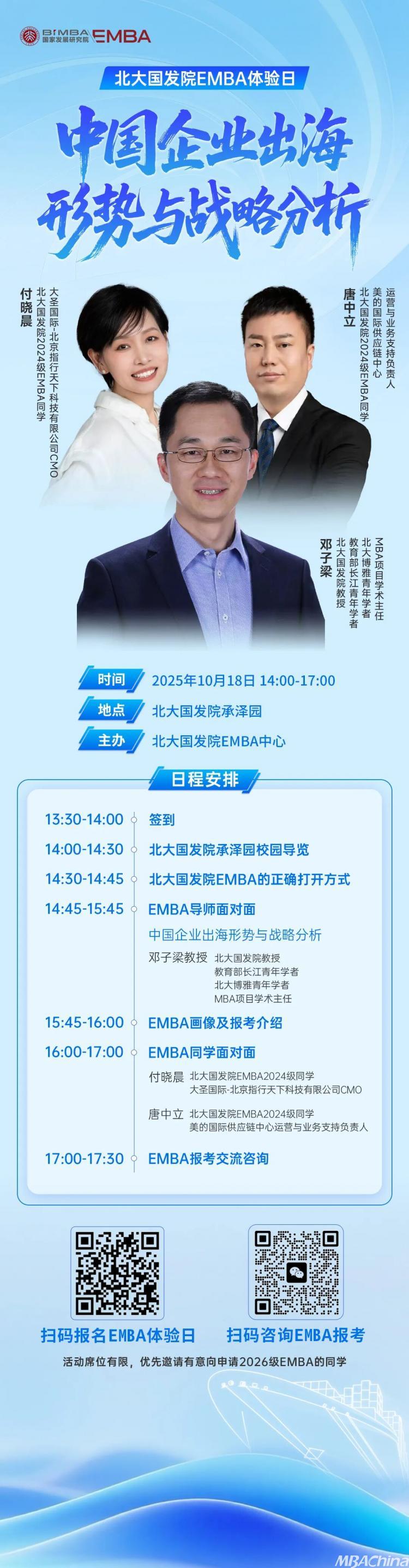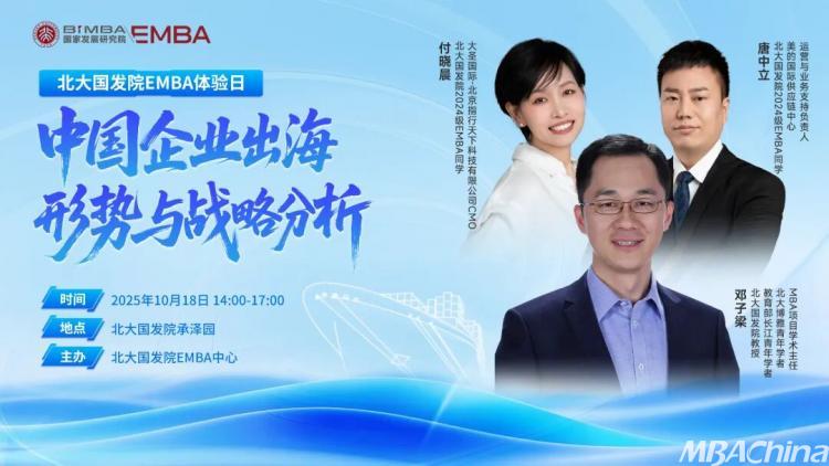 2025年10月18日,北大國(guó)發(fā)院EMBA體驗(yàn)日將聚焦“中國(guó)企業(yè)出海的形勢(shì)與戰(zhàn)略”,依托國(guó)家智庫(kù)的宏觀研究?jī)?yōu)勢(shì),邀請(qǐng)教授學(xué)者與校友企業(yè)家,從經(jīng)濟(jì)研究、國(guó)際戰(zhàn)略與企業(yè)管理多維視角,共同探討企業(yè)出海的機(jī)遇與挑戰(zhàn)。