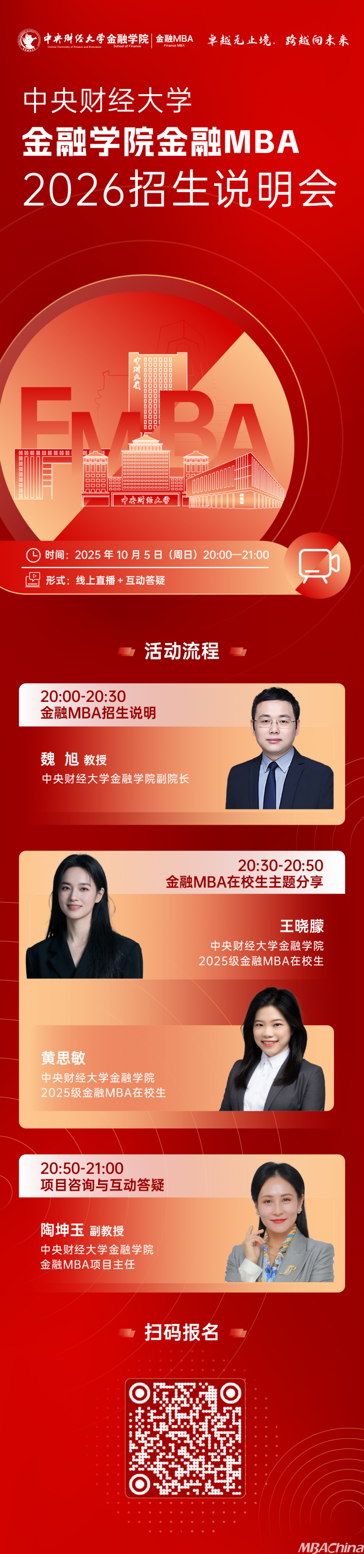 金融MBA考生請(qǐng)注意 | 2026中央財(cái)經(jīng)大學(xué)金融學(xué)院金融MBA招生說(shuō)明會(huì)(第二場(chǎng))線上開(kāi)啟