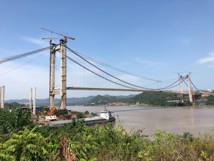 重慶長壽經(jīng)開區(qū)大橋(原名為重慶長壽長江二橋)為主跨739米的單跨雙鉸鋼箱梁懸索橋,是重慶長壽區(qū)的第一座跨越長江的懸索橋,橋面為雙向六車道設(shè)計(jì),全線總長3833米,主纜運(yùn)用PPWS法架設(shè),鋼箱梁采取非對(duì)稱纜索吊裝施工工藝,基于智能化旋轉(zhuǎn)吊具的大噸位纜吊系統(tǒng),實(shí)現(xiàn)了12米長的大重量(220噸)合龍段鋼箱梁一步吊裝到位,合龍端牽引精準(zhǔn)快速合龍段合龍的新工法,此工法經(jīng)專家組鑒定達(dá)到了國際領(lǐng)先水平。