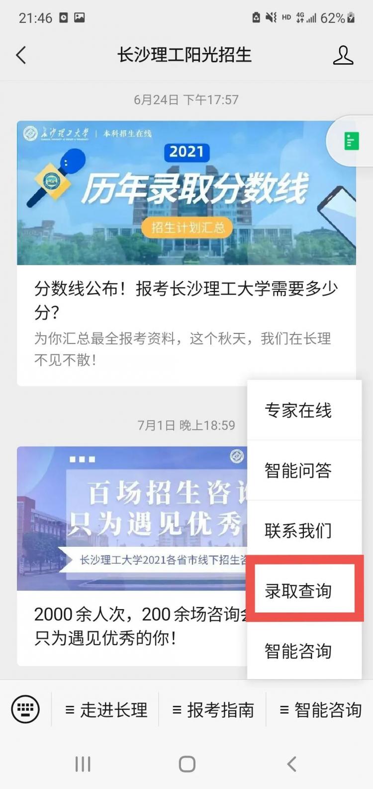 考生可通過微信公眾號“長沙理工陽光招生”,點擊下方菜單“智能咨詢”-“錄取查詢”,輸入身份證號和考生號查詢錄取結果。