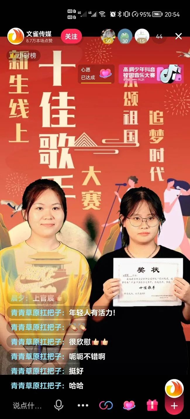 本次線上十佳歌手比賽創(chuàng)新性地邀請(qǐng)校內(nèi)大學(xué)生創(chuàng)新創(chuàng)業(yè)傳媒公司團(tuán)隊(duì),采用線上抖音直播,通過傳媒公司抖音賬號(hào)引流,為線上十佳歌手比賽增加關(guān)注度與人氣值,決賽直播現(xiàn)場(chǎng)歌聲嘹亮,旋律飄揚(yáng),全場(chǎng)點(diǎn)贊數(shù)超過8.7萬(wàn)余次。體現(xiàn)經(jīng)管學(xué)子積極向上的精神風(fēng)貌。