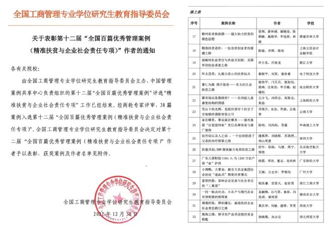 由全國工商管理專業(yè)學位研究生教育指導委員會主辦、中國管理案例共享中心負責組織的第十二屆“全國百篇優(yōu)秀管理案例”評選中(精準扶貧與企業(yè)社會責任專項),我校教師堅瑞撰寫的(《敢叫農者換新顏——超大助力扶貧...