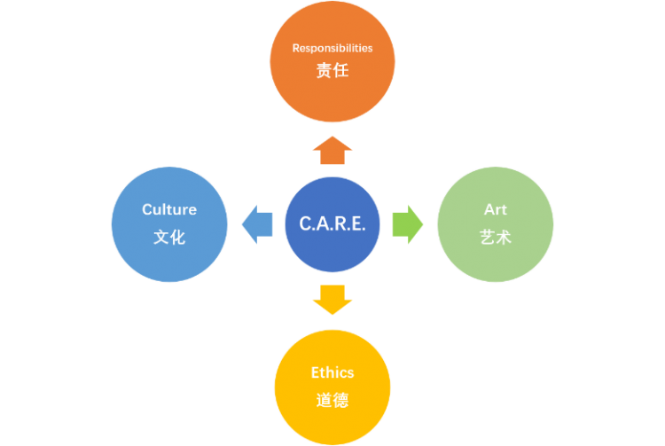“C.A.R.E.”是Culture, Art, Responsibilities, Ethics 四個(gè)單詞的首字母縮寫, 中文譯為文化、藝術(shù)、責(zé)任和道德。
