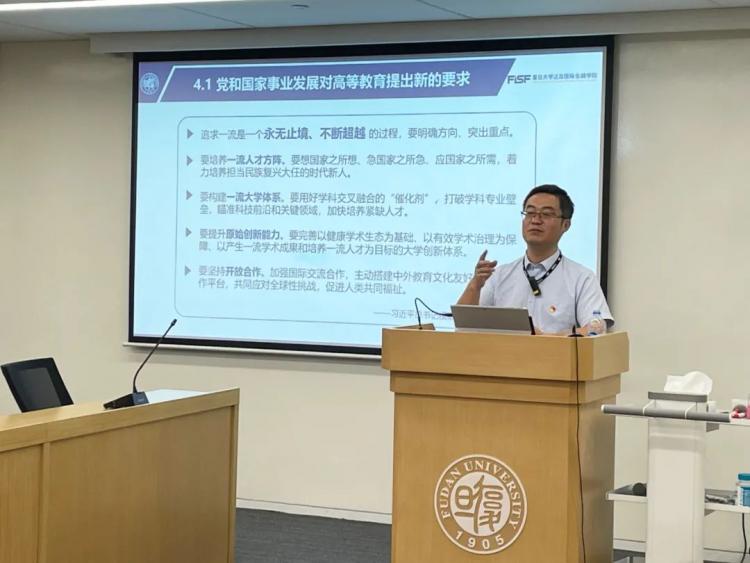 2021年6月28日,在慶祝中國共產(chǎn)黨成立一百周年之際,復旦大學泛海國際金融學院在黃浦港陸院區(qū)舉辦了一場面向全體教職工和學生黨員代表的專題學習活動。學院黨總支書記李粵江為師生們奉獻了一堂主題為“百年黨史與復旦大學的發(fā)展”的黨課。學院黨總支副書記、科研副院長高華聲教授主持此次黨課。