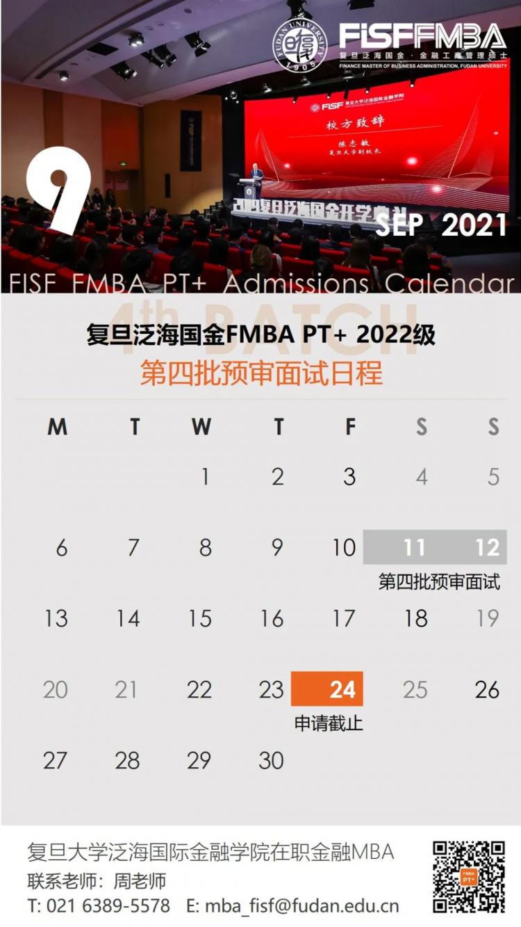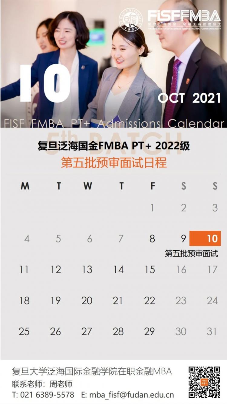 鑒于目前申請(qǐng)人數(shù),復(fù)旦泛海國(guó)金在職金融MBA項(xiàng)目(FMBA PT+)將在2021年10月10日新增一批預(yù)審面試,具體信息見(jiàn)官網(wǎng)公示。
