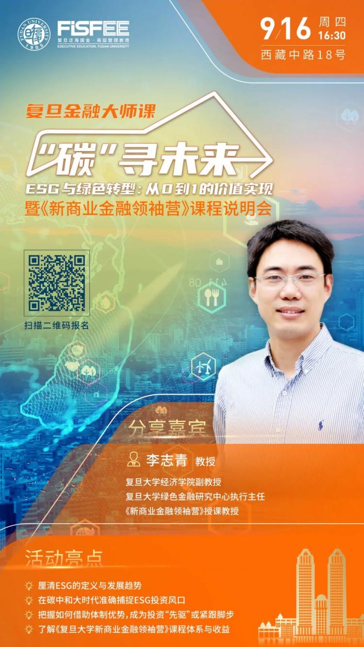 2021年9月16日周四16:30,邀您聆聽(tīng)復(fù)旦金融大師課“ESG與綠色轉(zhuǎn)型:從0到1的價(jià)值實(shí)現(xiàn)——‘碳’尋未來(lái)暨《新商業(yè)金融領(lǐng)袖營(yíng)》說(shuō)明會(huì)”。活動(dòng)將邀請(qǐng)復(fù)旦大學(xué)經(jīng)濟(jì)學(xué)院副教授、復(fù)旦大學(xué)綠色金融研究中心執(zhí)行主任、《新商業(yè)金融領(lǐng)袖營(yíng)》授課教授李志青做主題分享。李志青教授是美國(guó)耶魯大學(xué)、加州大學(xué),德國(guó)哥廷根大學(xué)、康斯坦茨大學(xué)等大學(xué)訪問(wèn)學(xué)者,主要研究領(lǐng)域?yàn)榫G色金融、環(huán)境經(jīng)濟(jì)學(xué)、能源與氣候變化經(jīng)濟(jì)學(xué)等。