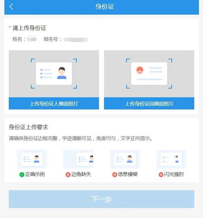 上傳考生本人身份證正反面照片。按照系統(tǒng)要求上傳,確保身份證邊框完整,字跡清晰可見,亮度均勻。