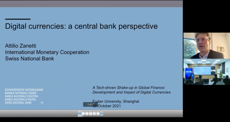 會議上,復(fù)旦大學(xué)泛海國際金融學(xué)院執(zhí)行院長、金融學(xué)教授錢軍致開幕辭。國際清算銀行數(shù)字經(jīng)濟首席經(jīng)濟學(xué)家Raphael Auer,瑞士央行國際貨幣合作司司長Attilio Zanetti,螞蟻集團研究院院長李振華作主旨演講。在圓桌對話環(huán)節(jié),復(fù)旦大學(xué)泛海國際金融學(xué)院學(xué)術(shù)副院長、金融學(xué)教授張純信,復(fù)旦大學(xué)泛海國際金融學(xué)院金融學(xué)教授黃毅與Raphael Auer、Attilio Zanetti、李振華一同就科技驅(qū)動全球金融變革等話題展開精彩討論。錢軍教授擔(dān)任本次圓桌會議主持人,并致閉幕辭。
