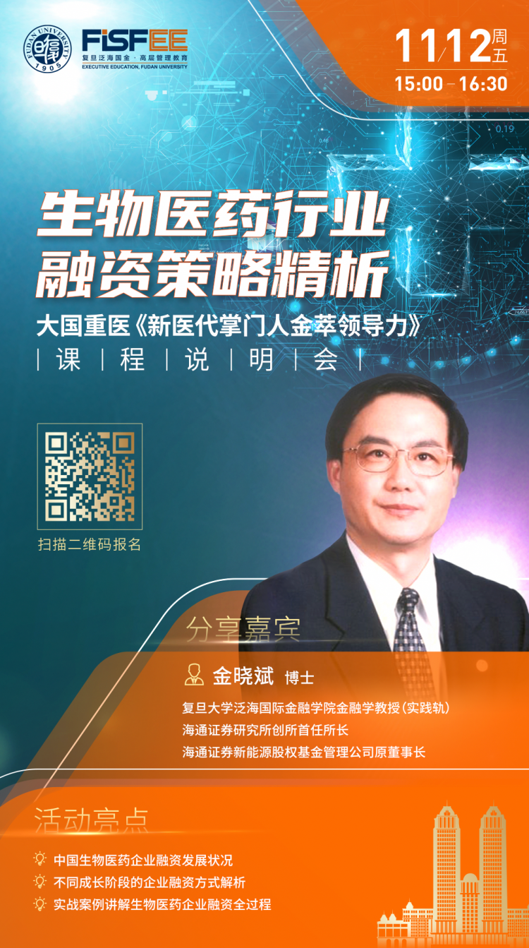 2021年11月12日(周五)15點(diǎn),復(fù)旦大學(xué)泛海國際金融學(xué)院高層管理教育將在黃浦院區(qū)(西藏中路18號)舉辦“大國重醫(yī)”——《新醫(yī)代掌門人金萃領(lǐng)導(dǎo)力》課程說明會(huì)。活動(dòng)將邀請學(xué)院金融學(xué)教授、海通證券研究所創(chuàng)所首任所長、海通證券新能源股權(quán)基金管理公司原董事長金曉斌做主題分享。金曉斌教授將從自己的實(shí)戰(zhàn)經(jīng)驗(yàn)講解生物醫(yī)藥企業(yè)融資全過程,明晰不同成長階段的企業(yè)融資方式。