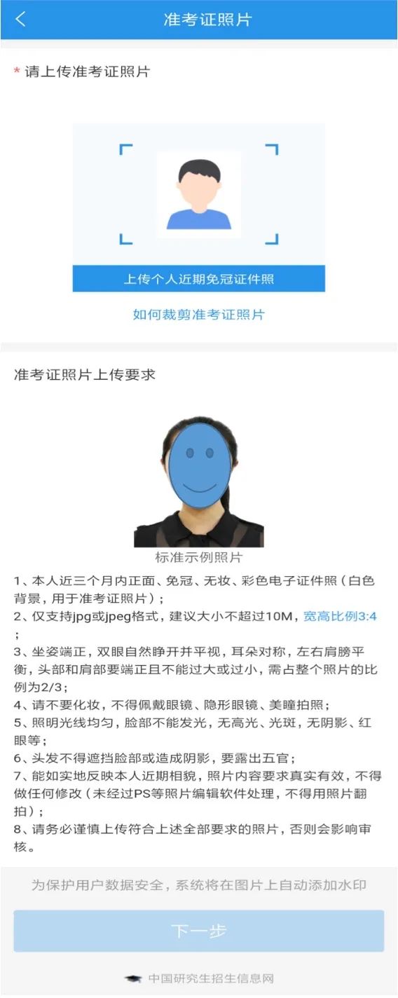 此照片將作為準(zhǔn)考證照片、復(fù)試錄取環(huán)節(jié)、校園一卡通等照片使用,請(qǐng)務(wù)必按要求上傳。