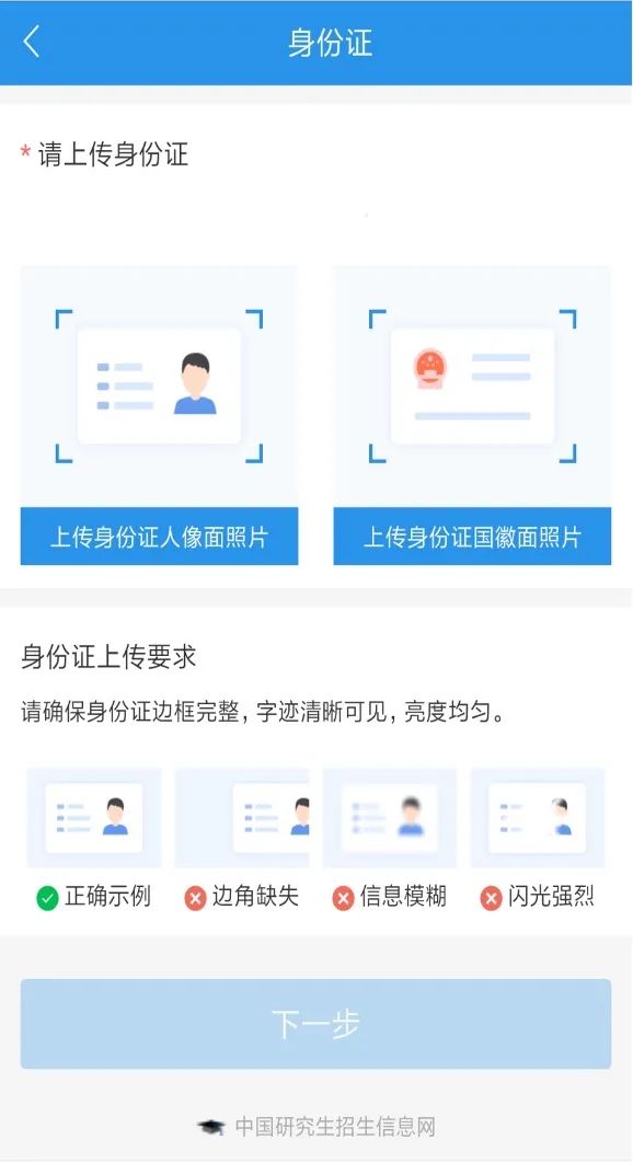 2.上傳考生本人身份證正反面照片,按照系統(tǒng)要求上傳,確保身份證邊框完整,字跡清晰可見(jiàn),亮度均勻。