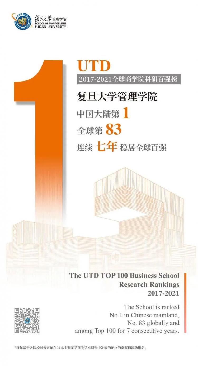 2022年:UTD最新發(fā)布2017-2021年全球商學(xué)院科研排名百強(qiáng)榜,復(fù)旦大學(xué)管理學(xué)院位列全球第83位,連續(xù)7年進(jìn)入全球百強(qiáng),再次位居中國大陸第一。