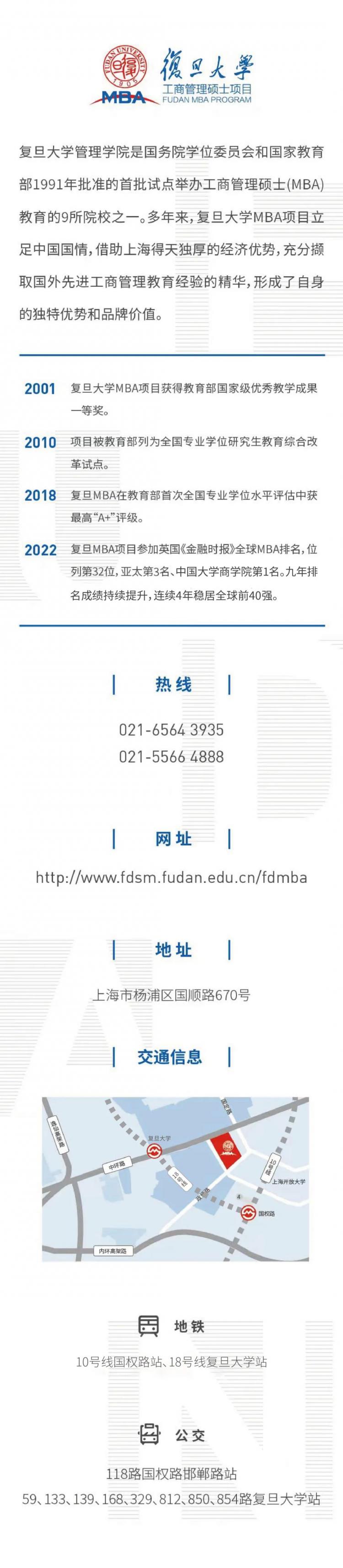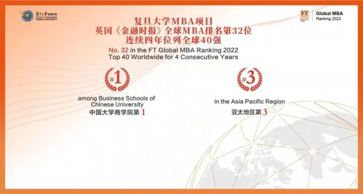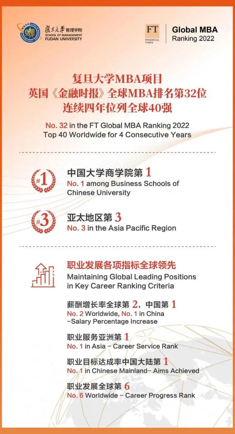 2022年:復(fù)旦MBA項(xiàng)目參加英國《金融時(shí)報(bào)》全球MBA排名,位列第32位,亞太第3名、中國大學(xué)商學(xué)院第1名。九年排名成績持續(xù)提升,連續(xù)4年穩(wěn)居全球前40強(qiáng)。