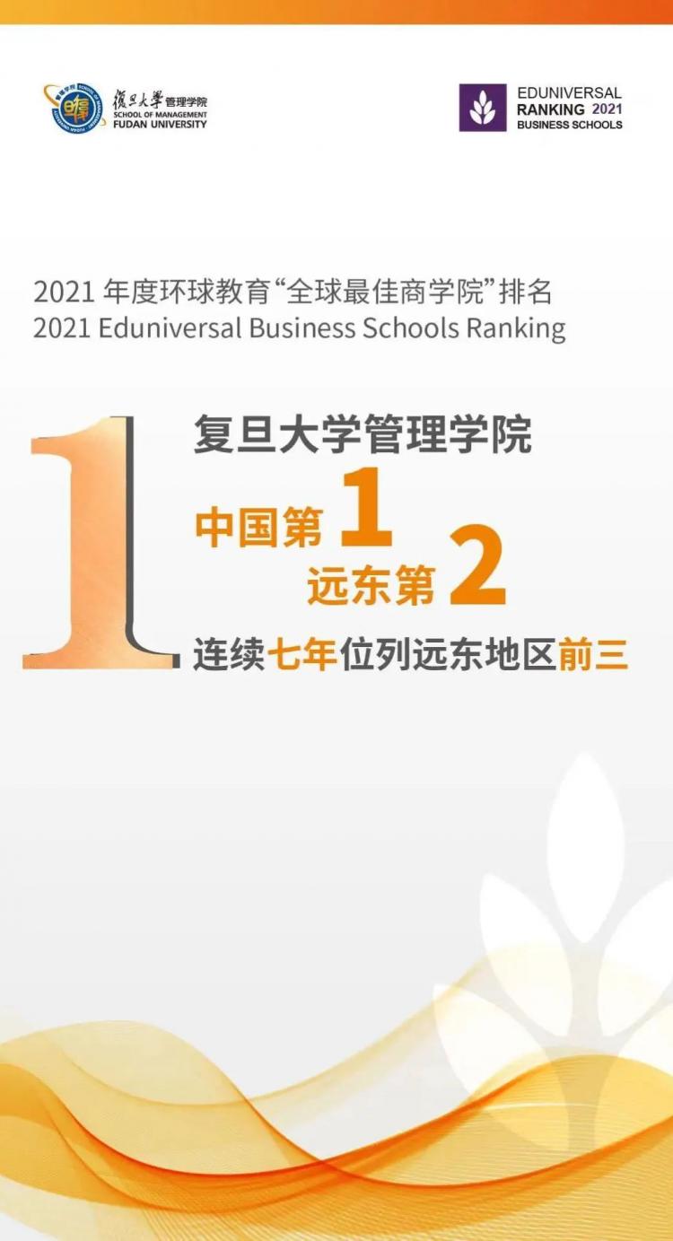 2021年:環(huán)球教育“全球最佳商學(xué)院排名”揭曉,復(fù)旦大學(xué)管理學(xué)院榮獲中國第一名,遠(yuǎn)東地區(qū)第二名,連續(xù)七年位列遠(yuǎn)東地區(qū)前三。