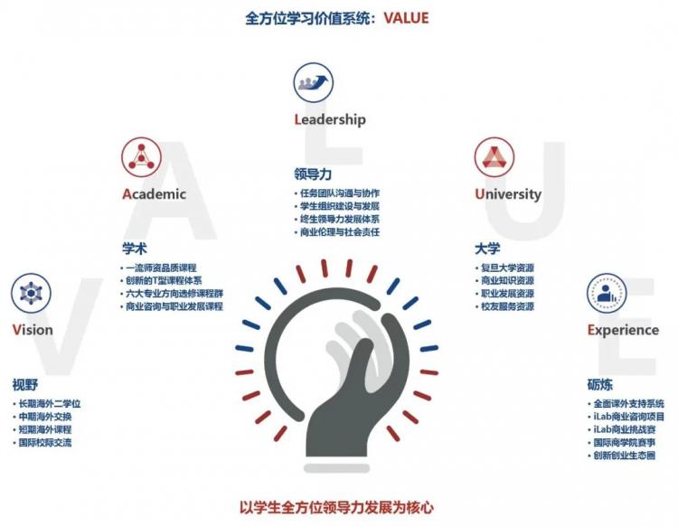 在深入研究經(jīng)濟(jì)發(fā)展新特征、全面融合中西管理教育新理念的基礎(chǔ)上,復(fù)旦MBA大膽創(chuàng)新,持續(xù)完善MBA教育培養(yǎng)體系,構(gòu)建出具有知識(shí)深度、科學(xué)高度和能力廣度的全方位學(xué)習(xí)價(jià)值系統(tǒng):VALUE。