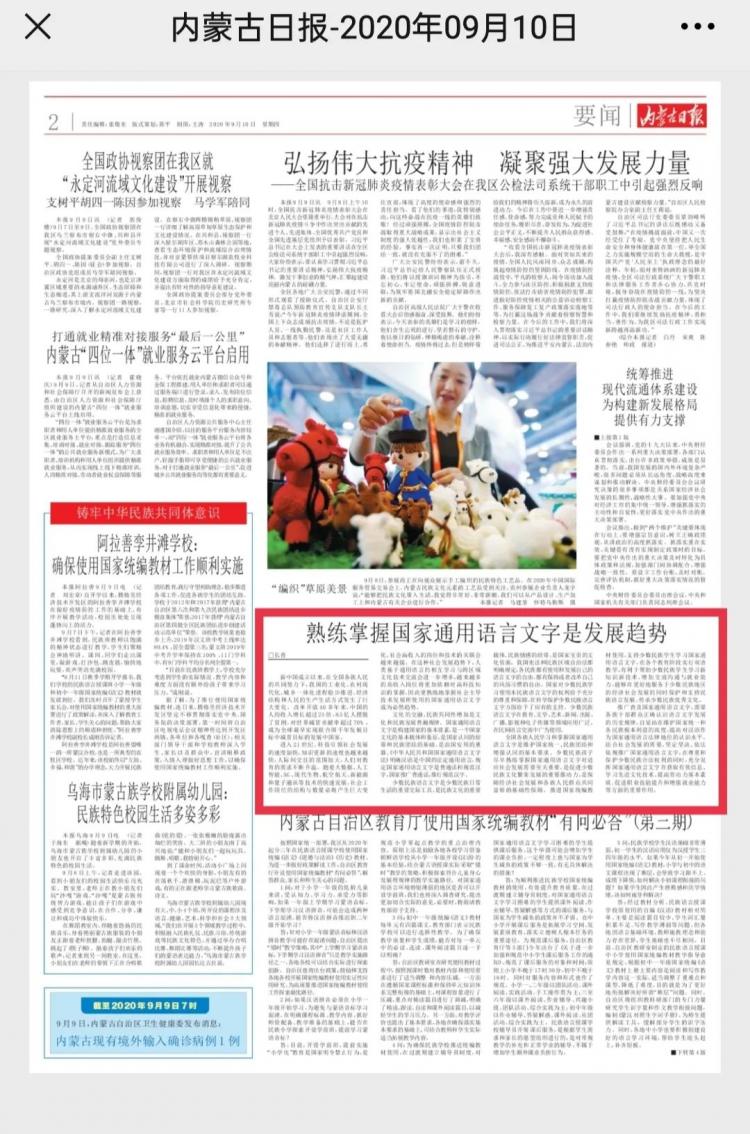 ·內(nèi)蒙古工業(yè)大學(xué)經(jīng)濟(jì)管理學(xué)院· 內(nèi)蒙古日?qǐng)?bào)-2020年09月10日 熟練掌握國(guó)家通用語(yǔ)言文字是發(fā)展趨勢(shì) 長(zhǎng)青 新中國(guó)成立以來(lái),在全國(guó)各族人民的共同努力下,我國(guó)的工業(yè)化、農(nóng)村現(xiàn)代化、城鄉(xiāng)一體化進(jìn)程...