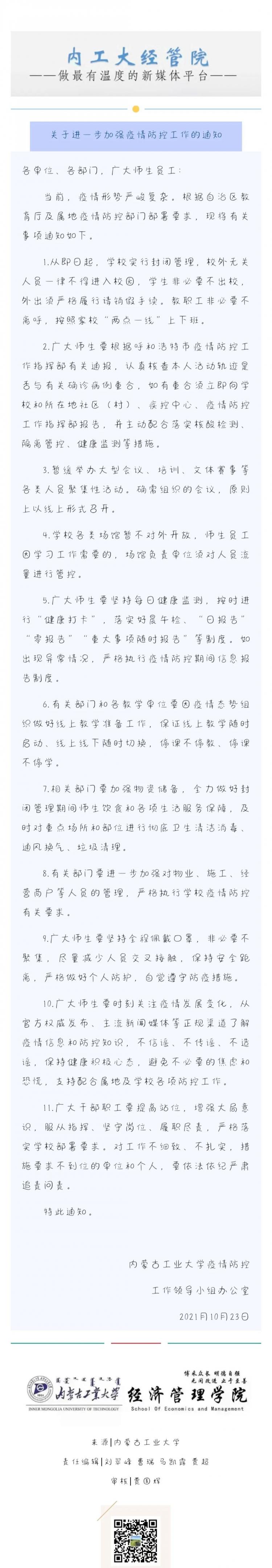 10月23日,呼和浩特市突發(fā)疫情。頓如一道驚雷,打破校園的寧靜。連日來,經(jīng)濟管理學(xué)院迅速采取一系列舉措不斷開展疫情防控工作。疫情就是命令,防控就是責(zé)任,經(jīng)管上下立即行動,一場突如其來的疫情防控阻擊戰(zhàn)正式打響。