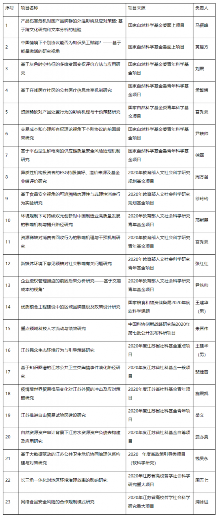 近期,國(guó)家自然科學(xué)基金委員會(huì)、江蘇省哲學(xué)社會(huì)科學(xué)規(guī)劃辦公室陸續(xù)公布了2020年度國(guó)家自科基金與江蘇省社科基金、江蘇省軟科學(xué)等項(xiàng)目的資助名單,學(xué)院14個(gè)項(xiàng)目獲得立項(xiàng)。其中,國(guó)家自科基金項(xiàng)目獲批7項(xiàng),其中面上項(xiàng)目2項(xiàng),青年基金項(xiàng)目5項(xiàng);江蘇省社科基金項(xiàng)目獲批5項(xiàng),其中重點(diǎn)項(xiàng)目1項(xiàng),一般項(xiàng)目3項(xiàng), 自籌經(jīng)費(fèi)項(xiàng)目1項(xiàng);江蘇省軟科學(xué)項(xiàng)目1項(xiàng)、國(guó)家糧食和物資儲(chǔ)備局2020年度軟科學(xué)課題1項(xiàng)、中國(guó)科協(xié)創(chuàng)新戰(zhàn)略研究院2020年第七批公開(kāi)發(fā)布科研項(xiàng)目1項(xiàng)。此外,本年年初我院教育部課題立項(xiàng)6項(xiàng),其中規(guī)劃基金項(xiàng)目2項(xiàng),青年基金4項(xiàng) 。截至目前,我院本年度共獲省部級(jí)以上課題23項(xiàng)。