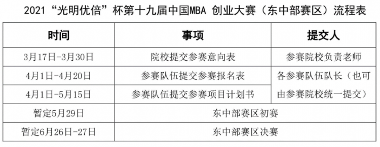 由上海交通大學(xué)安泰經(jīng)濟(jì)與管理學(xué)院、光明乳業(yè)股份有限公司、南京大學(xué)商學(xué)院聯(lián)合主辦,南京大學(xué)商學(xué)院MBA教育中心承辦,江南大學(xué)MBA教育中心、南京航空航天大學(xué)MBA教育中心、南京理工大學(xué)MBA教育中心、江蘇高校創(chuàng)投俱樂部聯(lián)盟聯(lián)合協(xié)辦的2021“光明優(yōu)倍”杯第十九屆中國(guó)MBA創(chuàng)業(yè)大賽(東中部賽區(qū)),將于2021年3月-6月在南京大學(xué)舉行。