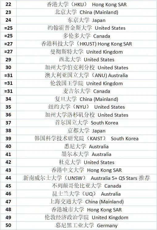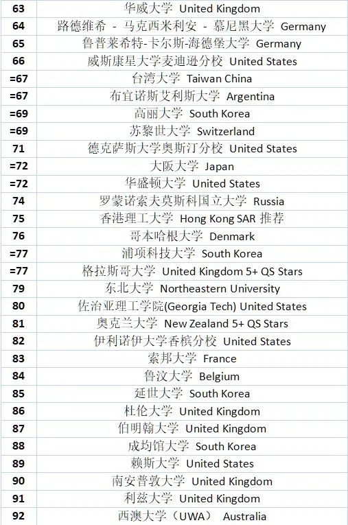 剩下107所在歐亞,其中比較知名的大學(xué)有日本的東京大學(xué)、京都大學(xué);新加坡的新加坡國立大學(xué)、南洋理工大學(xué);中國香港的香港大學(xué)、香港中文大學(xué)、香港理工大學(xué)等等。