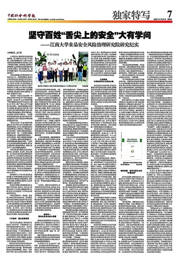 2月25日,《中國(guó)社會(huì)科學(xué)報(bào)》第2355期第7版《獨(dú)家特寫》欄目整版刊登《堅(jiān)守百姓“舌尖上的安全”大有學(xué)問——江南大學(xué)食品安全風(fēng)險(xiǎn)治理研究院研究紀(jì)實(shí)》,全景式呈現(xiàn)了吳林海教授領(lǐng)銜江南大學(xué)食品安全風(fēng)險(xiǎn)治理研究院10年來聚焦食品安全風(fēng)險(xiǎn)治理,堅(jiān)持問題導(dǎo)向,深入實(shí)際調(diào)查,推進(jìn)理論研究,為黨和政府建言獻(xiàn)策的主要做法、成功經(jīng)驗(yàn)與取得的成效。