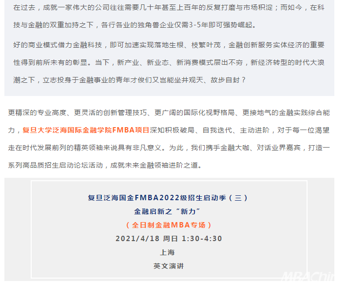 更精深的專業(yè)高度、更靈活的創(chuàng)新管理技巧、更廣闊的國際化視野格局、更接地氣的金融實踐綜合能力,復(fù)旦大學(xué)泛海國際金融學(xué)院FMBA項目深知積極破局、自我迭代、主動進(jìn)階,對于每一位渴望走在時代發(fā)展前列的精英領(lǐng)袖來說具有非凡意義。