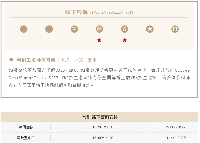 現(xiàn)每周四、五特定時段,SAIF MBA招生老師將為你全面解析金融MBA招生政策、培養(yǎng)體系和師資,為你在申請中所遇到的問題答疑解惑。