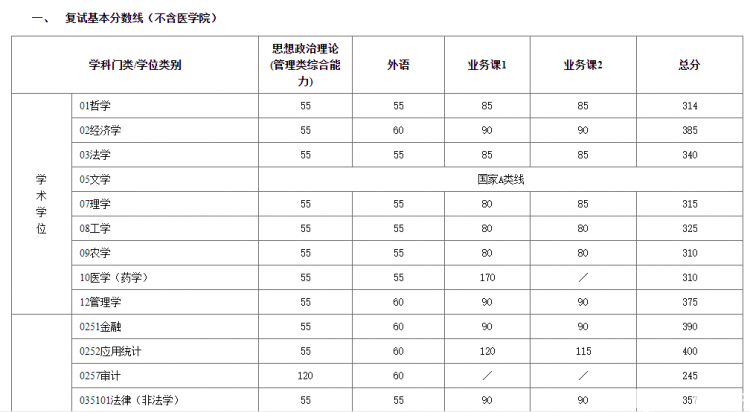 一、復(fù)試基本分?jǐn)?shù)線(不含醫(yī)學(xué)院)