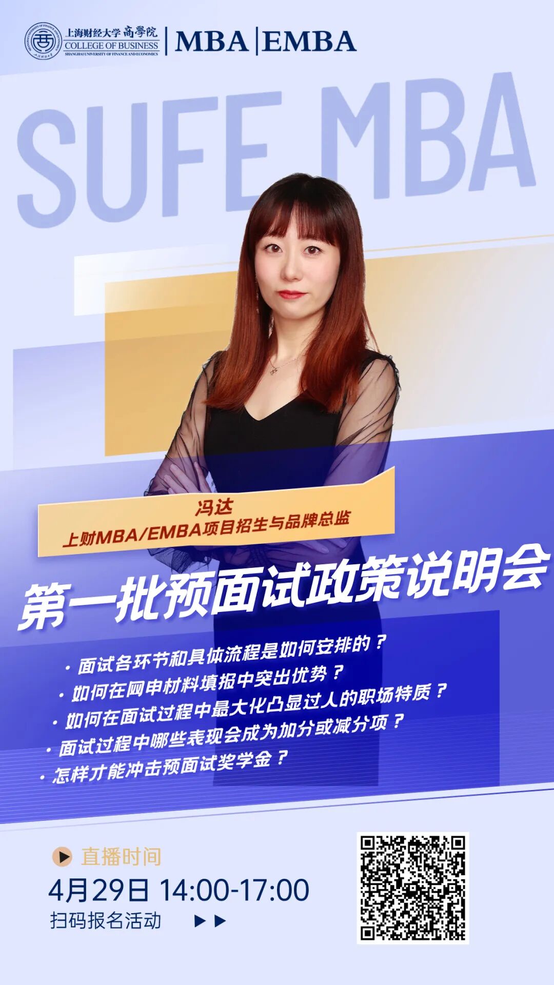 4月29日,針對上述Pre-Sufers極度關心的問題,上財MBA/EMBA項目招生與品牌總監(jiān)將為您講述:如何沖破層層關卡,讓面試官們對您青睞有加,讓上財MBA對您一見傾心!