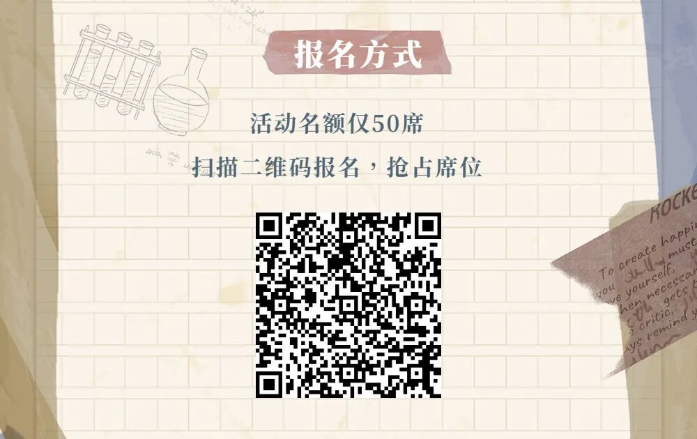 本次活動(dòng)僅限50人參加。本次活動(dòng)需要在完成報(bào)名和入校報(bào)備,切勿自行前往!報(bào)名成功后,我們將微信建群統(tǒng)一通知大家。