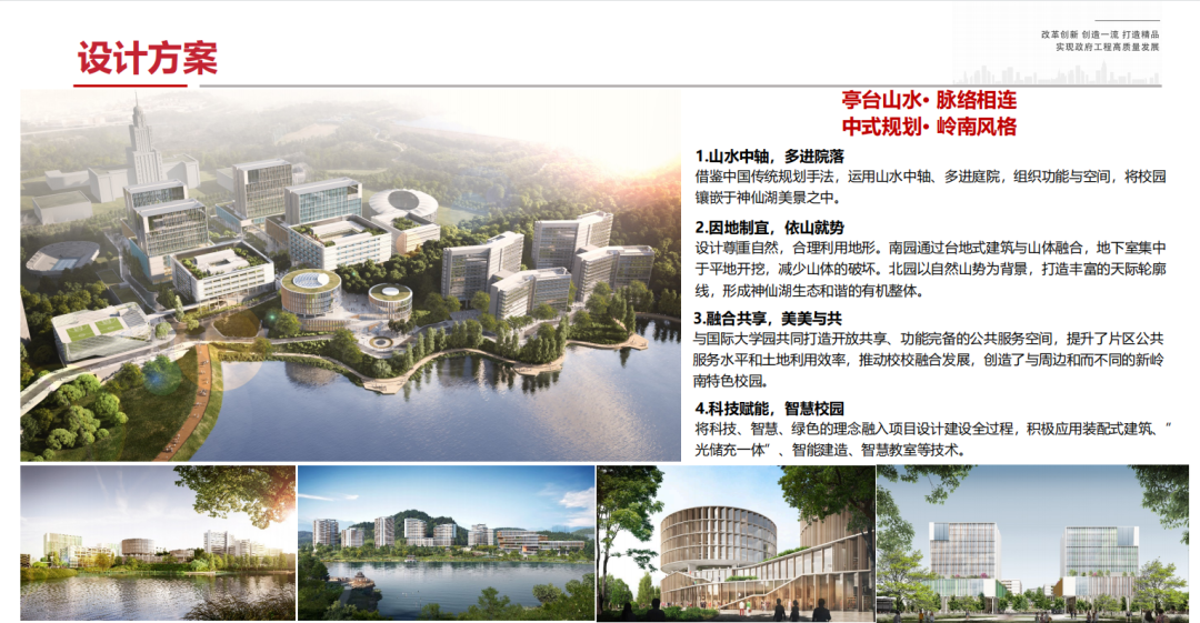 項目建設(shè)內(nèi)容包括新建教學(xué)大樓、實驗教學(xué)樓、科研大樓、圖書館、行政樓、教師公寓、學(xué)生書院以及室內(nèi)體育館等16棟建筑,改造1棟建筑,該項目充分發(fā)揮設(shè)計引領(lǐng)作用,以“亭臺山水,脈絡(luò)相連,中式規(guī)劃,嶺南風(fēng)格”作為校園整體設(shè)計理念和原則,努力營造山水校園、特色校園。
