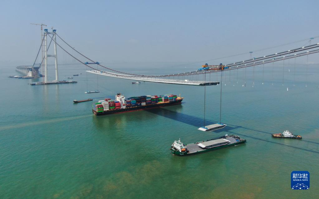 集裝箱貨輪通過正在吊裝鋼箱梁的深中通道伶仃洋大橋(圖源:新華社)