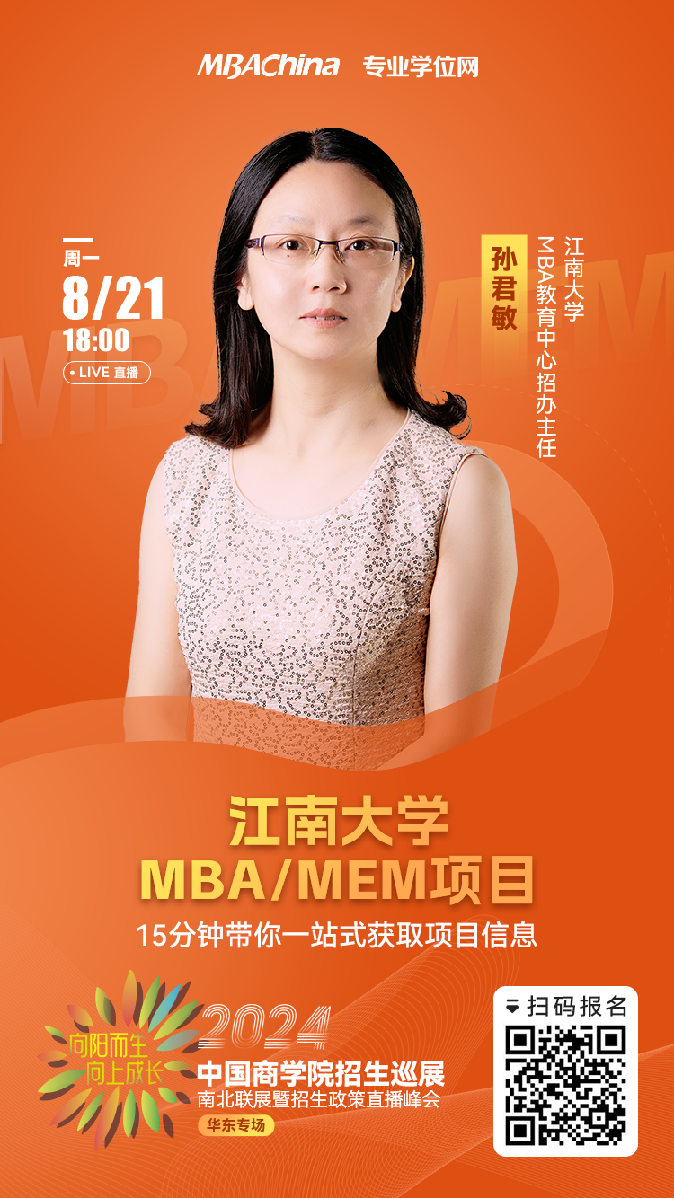 考研預(yù)報名即將開始,為助力考生全方位了解江南大學(xué)MBA/MEM項目,消除心中疑惑,順利備考成功上岸。江南大學(xué)MBA教育中心招辦主任孫君敏老師應(yīng)邀參與8月21日中國商學(xué)院南北聯(lián)展暨2024招生政策直播峰會(華東專場),在線直播解讀項目政策與報考指南。