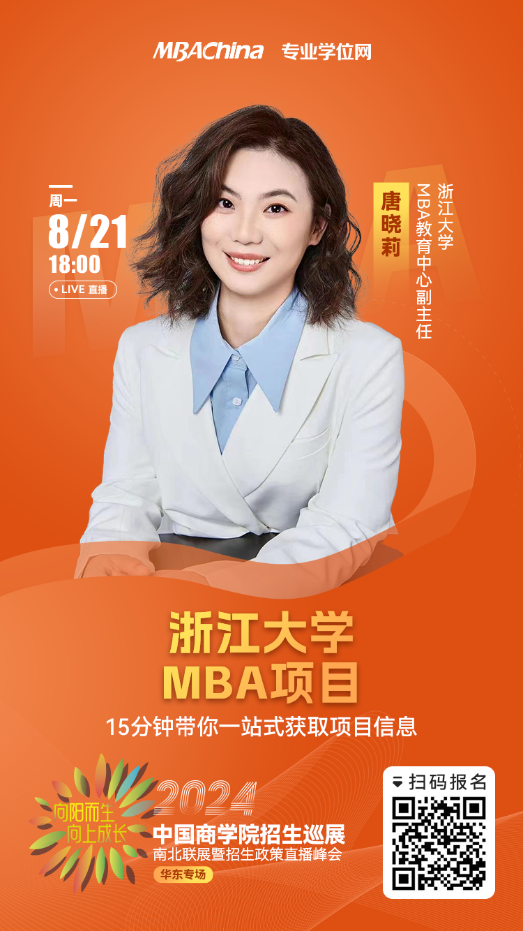 考研預(yù)報(bào)名即將開始,為助力考生全方位了解浙江大學(xué)MBA項(xiàng)目,消除心中疑惑,順利備考成功上岸。浙江大學(xué)MBA教育中心副主任唐曉莉老師應(yīng)邀參與8月21日中國商學(xué)院南北聯(lián)展暨2024招生政策直播峰會(華東專場),在線直播解讀項(xiàng)目政策與報(bào)考指南。
