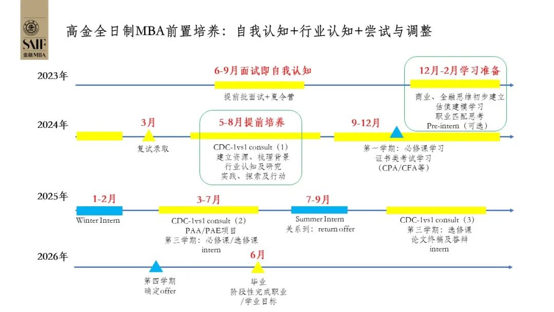 高金全日制MBA的培養(yǎng)圍繞職業(yè)發(fā)展展開,在入學(xué)前(2023年6月~2024年9月),通過面試、夏令營、1對1職業(yè)咨詢、知識儲備等多種形式的實踐與學(xué)習(xí),2024級預(yù)備生將在這個階段初步達成“自我認知+行業(yè)探索+嘗試與調(diào)整”;