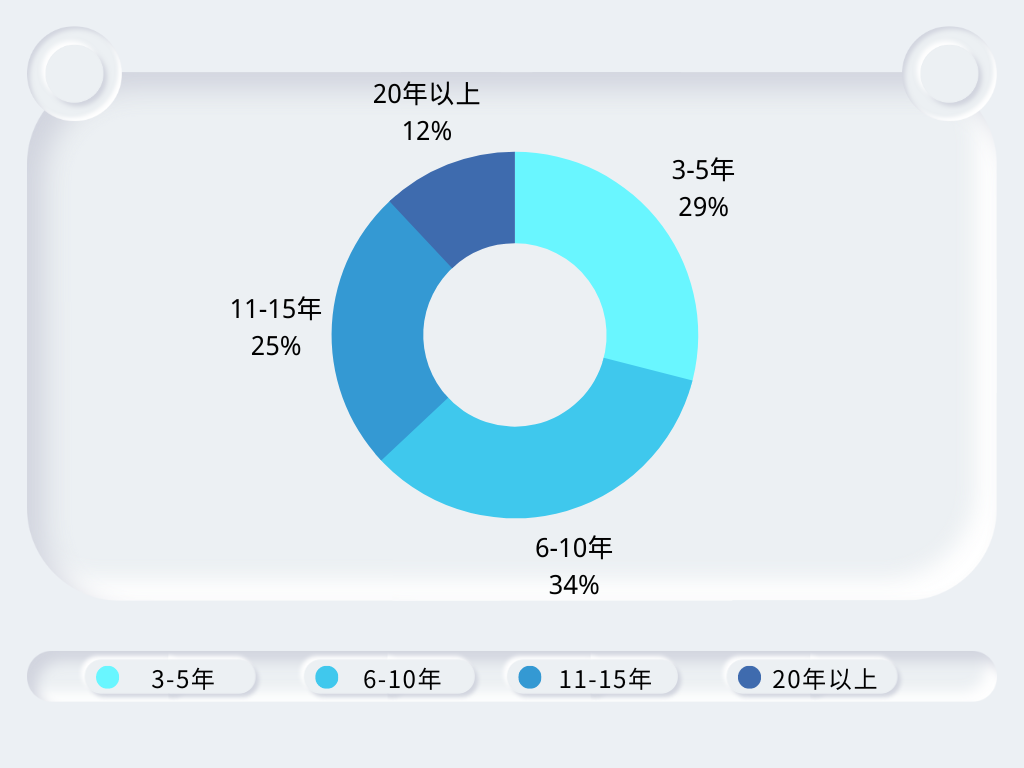 2023級新生的平均工作年限為9年。工作年限在6-10年的同學(xué)占比最高為34%。值得一提的是,有近10%的同學(xué)的工作年限超過15年(其中11位超過20年)。