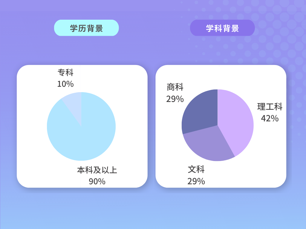 從入學(xué)前已經(jīng)取得的學(xué)歷來看,本科及以上占比90%。2023級同學(xué)的學(xué)科背景分布非常廣泛。其中理工科專業(yè)背景的同學(xué)最多,其次是文科和商科。