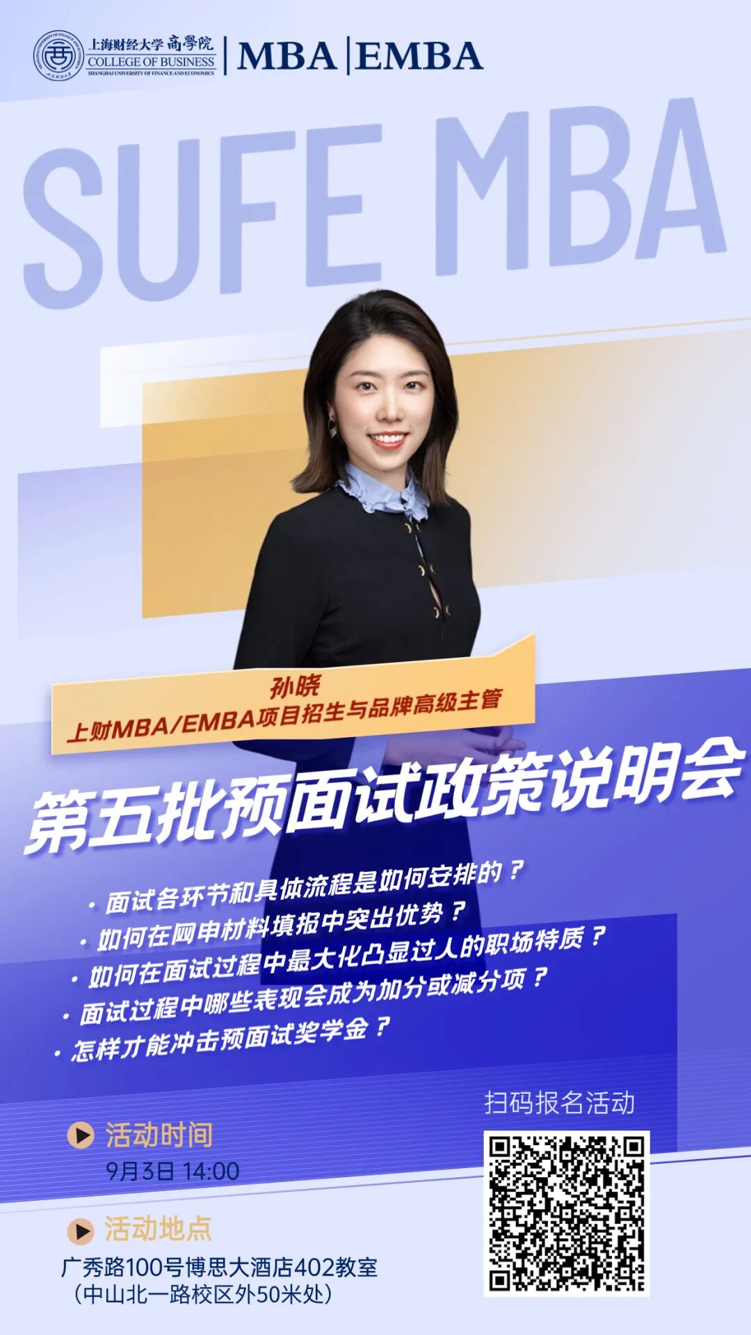 上海財經(jīng)大學(xué)2024年入學(xué)MBA(EMBA)第五批預(yù)面試將于9月3日(本周日)24時截止申請,請各位考生抓緊時間進(jìn)行網(wǎng)申并提交!