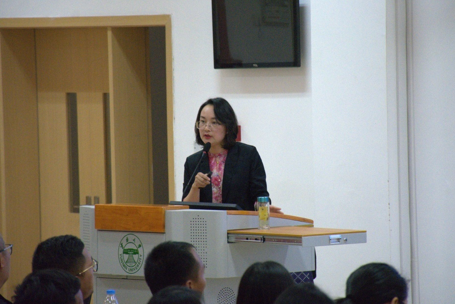 學院導師代表陳曦教授發(fā)言,她對即將開啟研究生生涯的各位同學表示了由衷的祝賀?!按髮W之道,在明明德,在親民,在止于至善”,她向同學們介紹了三種人:自我實現(xiàn)者、社會精英和傳薪者,并以此向同學們介紹了何為大學之道。自我實現(xiàn)者不安現(xiàn)狀,追求卓越,實現(xiàn)人生價值。而精英是一種精英意識。對重要事情的感知、對大多數(shù)人利益相關(guān)問題的關(guān)注、為大多數(shù)人的利益發(fā)聲是衡量精英的三條標準。百年云大,薪火相傳。她希望同學們在研究生學習中,培養(yǎng)自己的內(nèi)在精英意識,銘記先賢的智慧和品格。