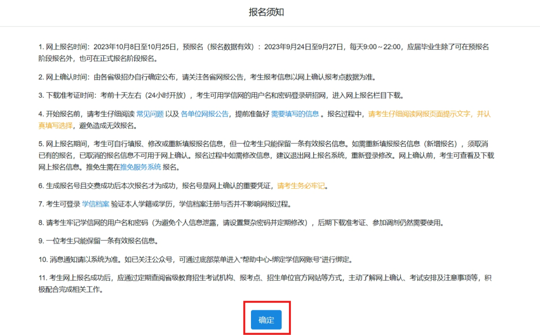 4、仔細(xì)閱讀所有內(nèi)容,點(diǎn)擊確定開始報名流程。