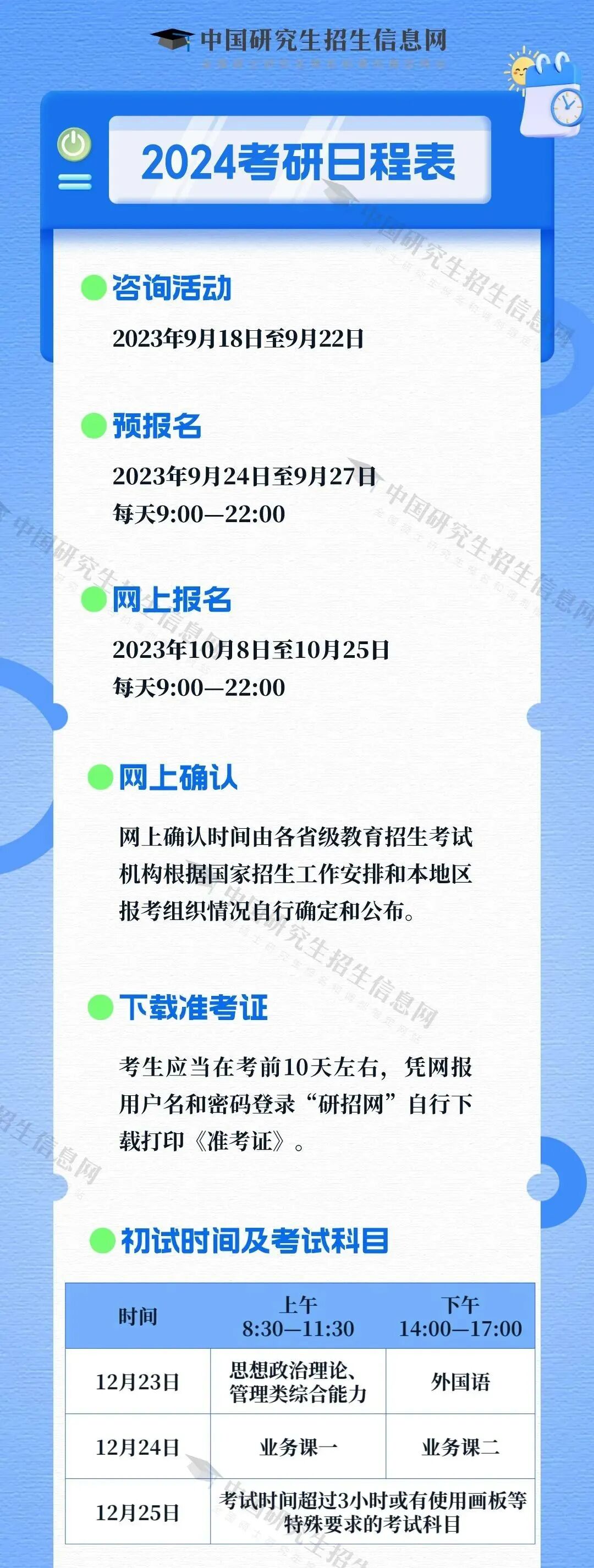 2024年全國(guó)統(tǒng)一考試(含聯(lián)合考試)預(yù)報(bào)名將于2023年9月24日至9月27日進(jìn)行。