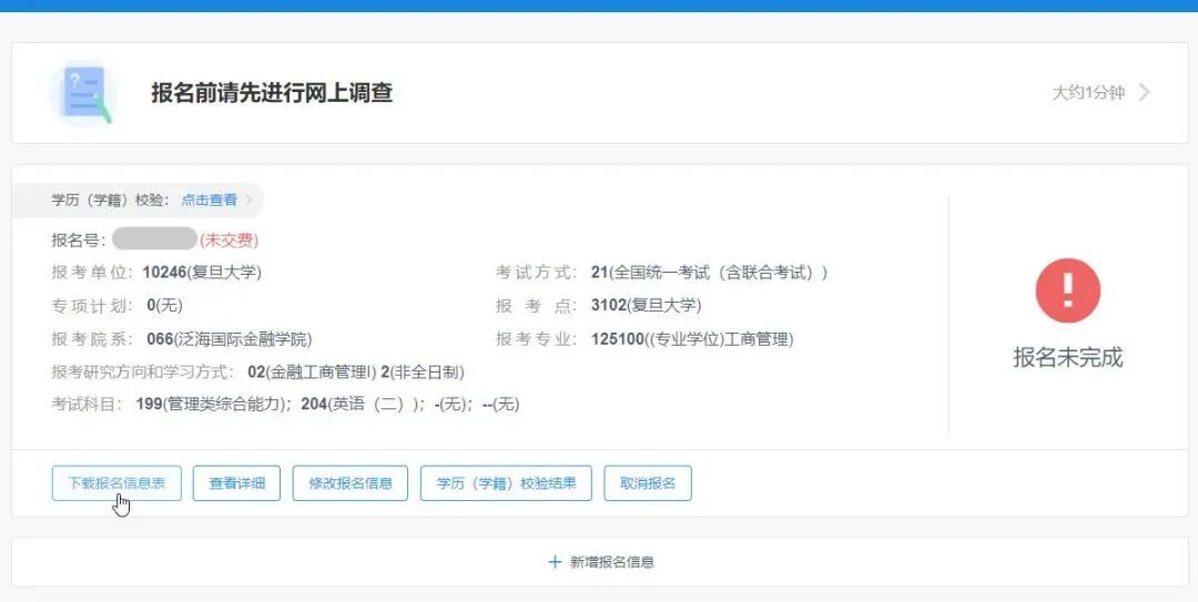 最后,校對(duì)所有已填報(bào)的信息確認(rèn)無誤后,生成考生報(bào)名號(hào),并下載報(bào)名信息表。