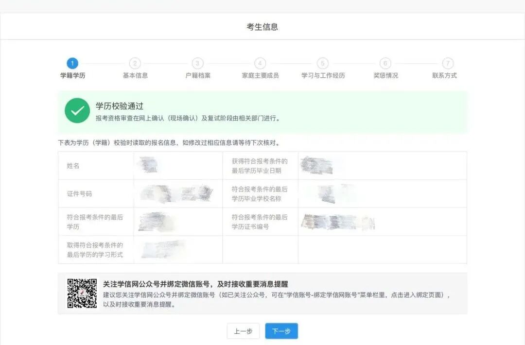 1. 學(xué)歷(學(xué)籍)校驗(yàn)涉及到的信息有:身份證號(hào)、姓名、獲得符合報(bào)考條件的最后學(xué)歷畢業(yè)日期、符合報(bào)考條件的最后學(xué)歷證書編號(hào)、符合報(bào)考條件的最后學(xué)歷畢業(yè)學(xué)校、獲得符合報(bào)考條件的最后學(xué)歷的學(xué)習(xí)形式、符合報(bào)考條件的最后學(xué)歷,請(qǐng)考生務(wù)必確保填寫的信息與實(shí)際證件完全一致。