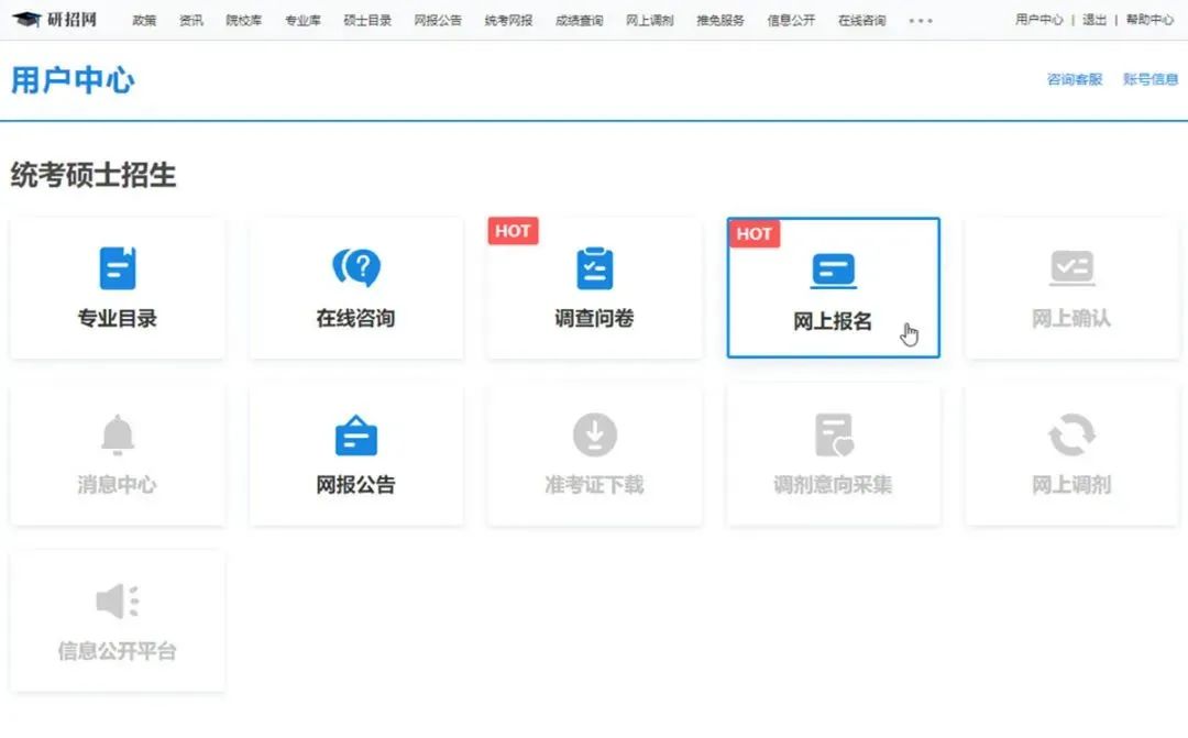 選擇“統(tǒng)考碩士招生”,開始“網(wǎng)上報(bào)名”。