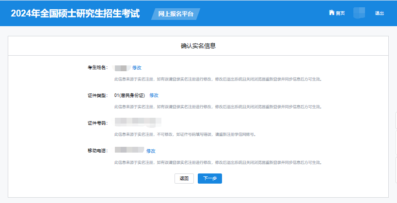確認(rèn)“實(shí)名信息”(此信息來源于學(xué)信網(wǎng)實(shí)名注冊(cè)信息,需仔細(xì)核對(duì)),點(diǎn)擊“下一步”。
