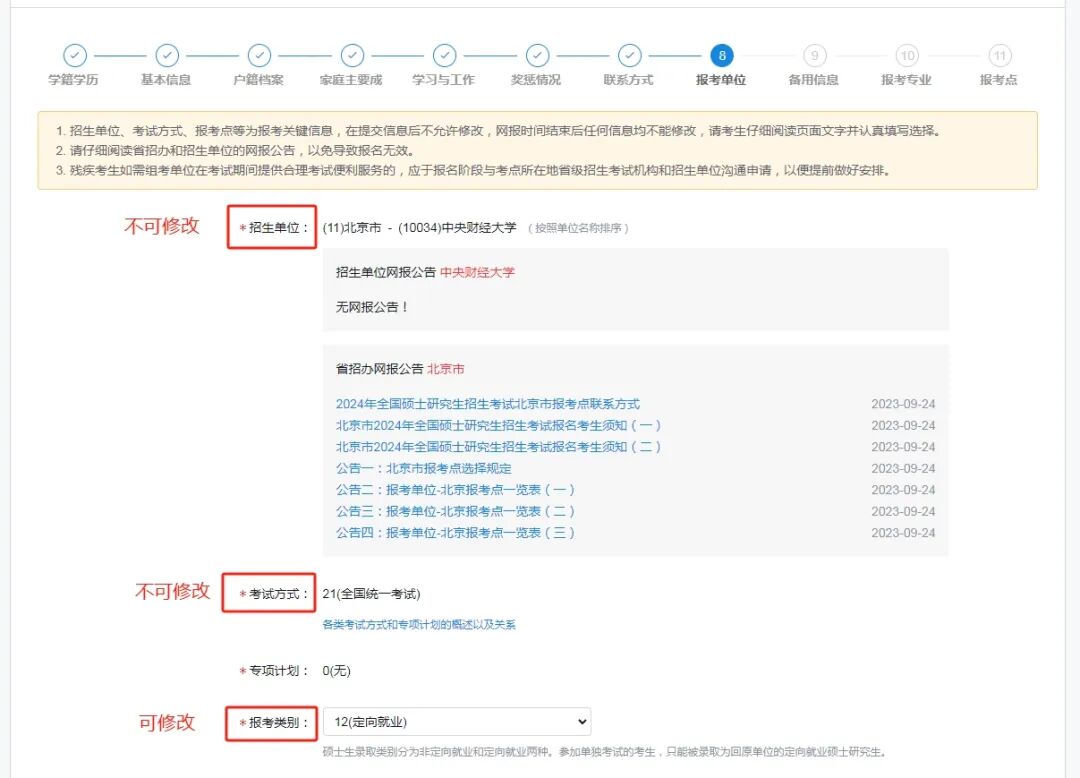 特別提醒:網(wǎng)上報名期間,考生可自行填報、修改或重新填報報名信息,但一位考生只能保留一條有效報名信息。招生單位、考試方式及報考點等報考關(guān)鍵信息不可修改(如下圖),其他報名信息可以修改。報名過程中如需修改信息,建議退出網(wǎng)上報名系統(tǒng),重新登錄修改。
