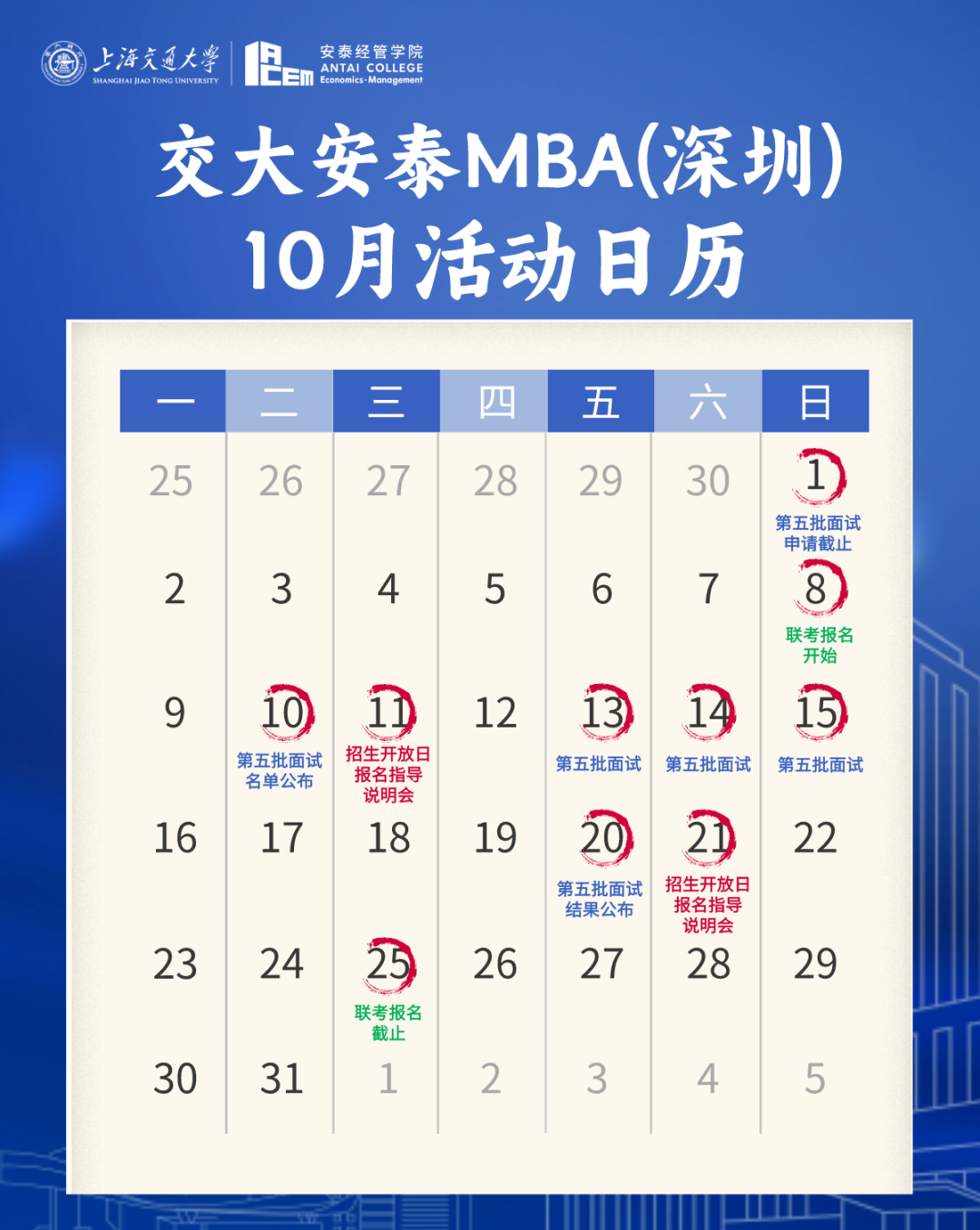 10月交大安泰MBA深圳招生活動(dòng)一覽 | 聯(lián)考報(bào)名截止前的最后一波活動(dòng)!筆試經(jīng)驗(yàn)、報(bào)名攻略、學(xué)長(zhǎng)學(xué)姐一站式分享!