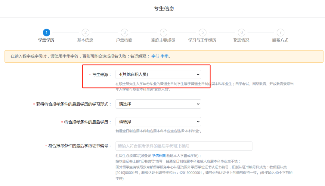 7.學籍學歷信息中“考生來源”一般為“4其他在職人員”。